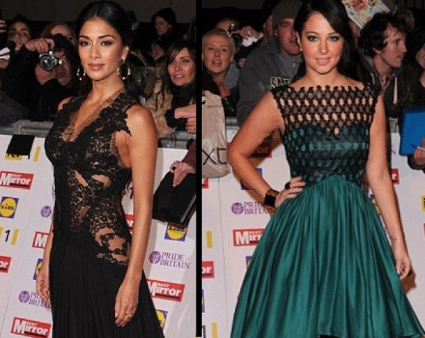 Tulisa Contostavlos, insa, s-a multumit cu o tinuta ceva mai cuminte, dar de efect. Rochia, intr-o nuanta de verde cu tonuri de turcoaz, avea in partea de sus dantela ce acoperea decolteul, facand tinuta cu atat mai provocatoare. Artista a combinat rochia cu o pereche de pantofi negri, stil peep-toe.
