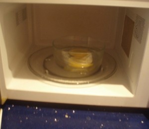 Mai intai, amesteca sucul de la o jumatate de lamaie intr-un vas/recipient cu apa - aproximativ 300 ml (ca in foto de mai jos). Se amesteca bine. Apoi pune solutia in cuptorul cu microunde si seteaza butonul la intensitate maxima si lasa vasul cu apa si lamaie la incalzit, timp de 5-10 minute.