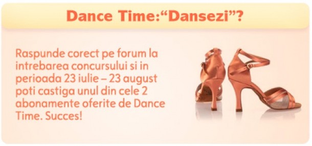 Pentru a participa va rugam sa raspundeti la intrebarea: “Ce alte dansuri, in afara celor mentinonate mai sus, mai pot fi studiate la DAnce Time la orele pentru incepatori?” accesand http://www.feminis.ro/forum/divertisment/timp-liber/dance-time-si-8220-dansezi-si-8221-37284/#last