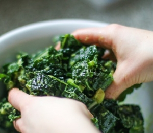 Tot ce trebuie să faci este să pui două-trei căni de frunze de kale într-un bol, apoi să presari o lingură de ulei de măsline, zeama de la o lămâie şi sare după gust, iar apoi să masezi cu mişcări delicate frunzele.