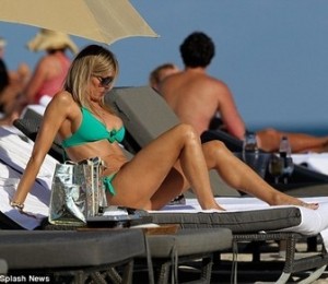Paparazzii au surprins-o, cum altfel, pe o plaja din Miami zilele trecute si purta un costum de baie verde din doua piese. Si-a dat seama fara doar si poate ca este fotografiata si a petrecut minute bune aranjandu-si costumul de baie si dandu-se cu crema de protectie. Desi conditia ei fizica atrage toata atentia, chipul ii tradeaza insa adevarata varsta.
