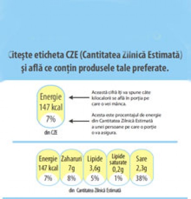 La un an si jumatate de la introducerea la nivel national al sistemului de etichetare nutritionala bazat pe Cantitatea Zilnica Estimata (CZE) cele mai importante companii din industria alimentara din Romania, sub umbrela Romalimenta – Coca-Cola, Kraft Foods Romania, Mars Romania, Nestle Romania, Star Foods o companie a PepsiCo si Unilever South Central Europe – continua campania de educare a consumatorilor cu scopul de a-i ajuta sa inteleaga informatiile oferite de etichetarea bazata pe CZE. Cantitatea Zilnica Estimata reprezinta cantitatea aproximativa de kilocalorii si macronutrienti pentru un adult cu greutate medie calculate pe baza unei alimentatii de 2000 kcal. Necesitatile individuale pot varia in functie de varsta, gen, efort fizic, etc.