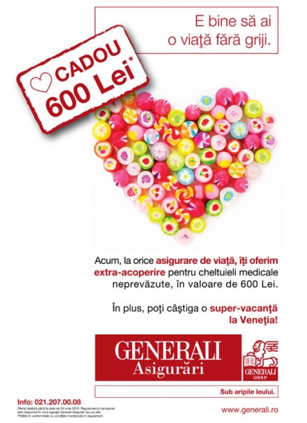 Din fericire, exista instrumente de incredere, reale si sigure care ne pot fi de mare ajutor. De exemplu, este foarte simplu sa-i protejezi pe cei dragi, daca-ti faci o asigurare de viata. Este cel mai bun cadou pe care ti-l poti oferi tie si celor dragi. Vei sti ca familia ta este mereu in siguranta orice s-ar intampla. Atunci chiar poti sa fii sigura pe tine! Vestea buna este ca daca inchei acum o asigurare de viata pana la 24 iunie 2010, Generali Asigurari iti ofera cadou 600 de lei extra-acoperire pentru cheltuieli medicale neprevazute, timp de un an. In plus, daca optezi pentru plata primei de asigurare prin debit direct, ai sansa de a participa la tragerea la sorti pentru marele premiu al campaniei: o vacanta la Venetia pentru doua persoane.
