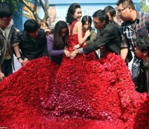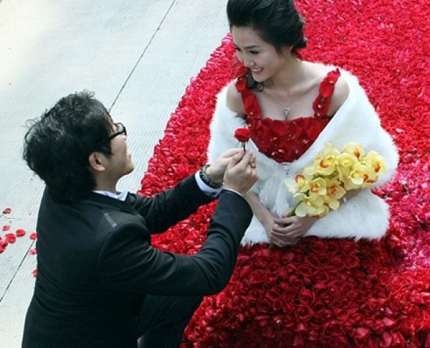 Fiindca partenera lui este pasionata de moda, Xiao Fan a facut in asa fel incat sa ii ofere de Valentine's Day o rochie de mireasa confectionata din 9.999 de trandafiri naturali. Trandafirul cu numarul 10.000 a fost cel pe care barbatul i l-a oferit lui Yin Mi atunci cand a cazut in genunchi pentru a o cere de sotie.