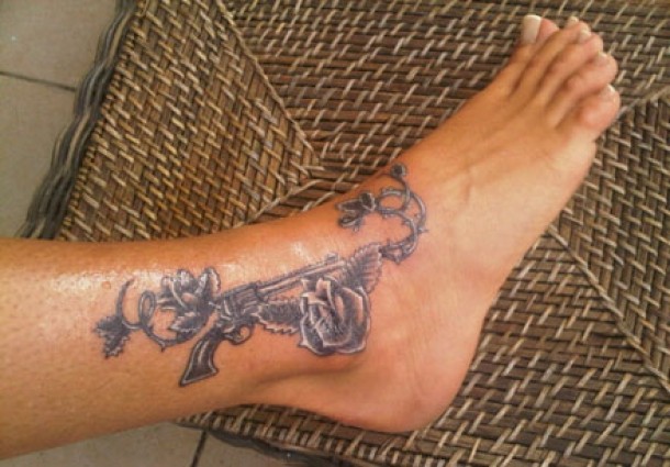Delia a prins gustul tatuajelor. In urma cu doua zile, blonda si l-a facut pe al doilea - un pistol mascat de un trandafir, alb-negru, ce coboara de deasupra gleznei pe laba piciorului.