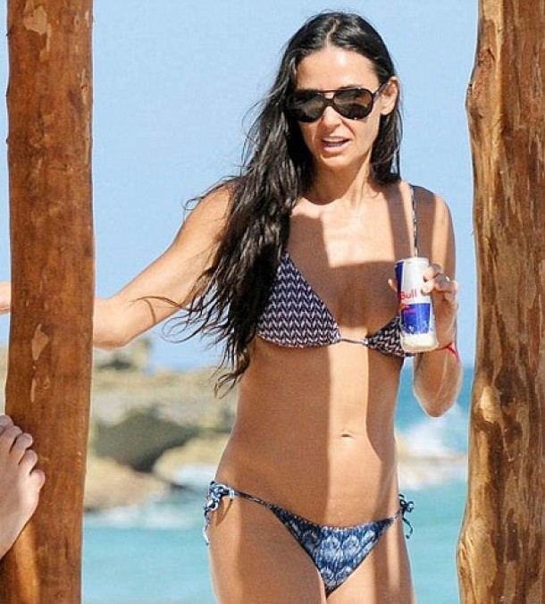 Demi Moore si-a etalat cu mandrie silueta care nu-i tradeaza varsta intr-un costum de baie minuscul, cu imprimeu.
