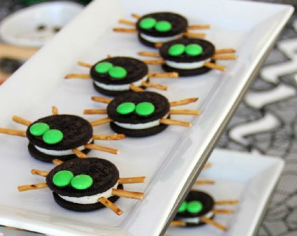 Rupe sticksurile in bucati si infige-le in crema de vanilie din biscuiti. Pune cate trei bucati de sticks pe o parte si trei pe cealalta parte, astfel incat sa arate precum piciorusele unui paianjen. Pune apoi, pe partea de sus a biscuitelui, cate doua bombonele Bonibon de culoare verde astfel incat sa para o pereche de ochi.