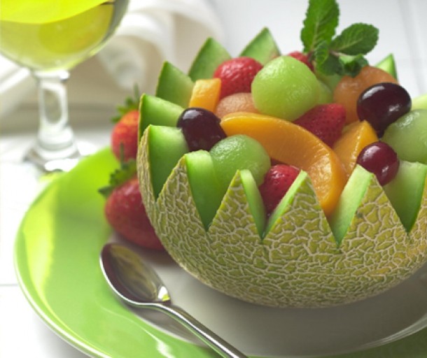 Dimineata : o salata de pepene galben impreuna cu alte fructe de vara, 50 g cereale integrale si 100 g iaurt degresat.