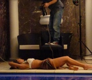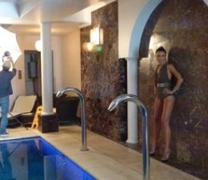 Aflata la piscina, imbracata in costum de baie, Carmen Bruma isi etaleaza silueta perfecta. Pantofii cu toc i-au pus in valoare picioarele lungi si tonifiate.