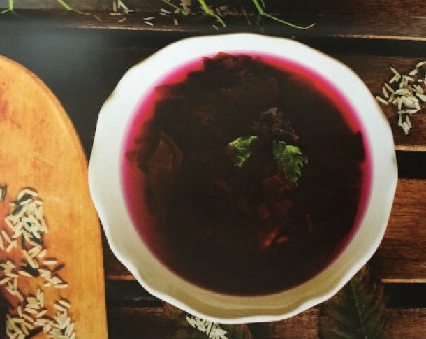Intr-o oala, pune la fiert apa, impreuna cu ceapa verde tocata marunt si orezul salbatic bine spalat. Intre timp, taie in fasii subtiri stevia, leusteanul si loboda.