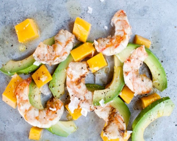 Ingrediente: 1/2 kg de creveti decorticati, 2 lamai medii, 2 avocado, 1 mango, sare, piper, ulei de masline.