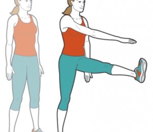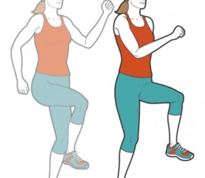 Tine picioarele mult departate si mainile pe langa corp. In timp ce indoi genunchiul drept la un unghi de 90 de grade adu si bratul stang in fata si indoaie-l. Printr-o saritura, treci de pe piciorul stang pe dreptul si adu bratul drept in fata si ridica genunchiul stang. Contina sa face aceasta alternare timp de 30 de secunde.