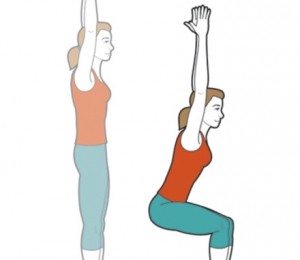 Stai cu picioarele usor departate si mainile ridicate deasupra capului, cat mai drepte. Indoaie genunchii si coboara in pozitie de genuflexiune, ca si cum ai sta pe un scaun imaginar, in timp ce mentii bratele intinse. Repeta miscarea timp de 30 de secunde.