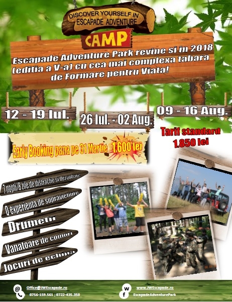 Escapade Adventure Park revine și în 2018 cu singura Tabără de Formare pentru Viață - "Discover Yourself in Escapade Adventure". Tabăra se adresează adolescenților cu vârste cuprinse între 14 și 18 ani.