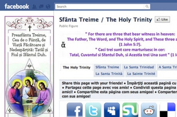 Recunosc: mi-e frica de cei care dau “like” la Sf. Treime pe Facebook!!! Tot in categoria “public figure”: Sf. Paraschieva of Iasi are 8.444 de like-uri si mai exista si pagina “Sfintii, prietenii luiDumnezeu”- or fi prieteni tot peFacebook??? Dislike!