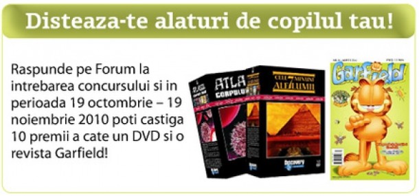 Raspunde pe Forum la intrebarea concursului si in perioada 19 octombrie – 19 noiembrie 2010 poti castiga 10 premii a cate un DVD si o revista Garfield! Premiile sunt oferite de Mediadocs (http://www.mediadocs.ro/).