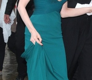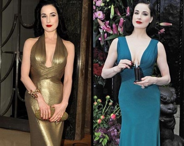 Pentru prima aparitie, Dita Von Teese a purtat o rochie verde smarald, care ii punea in evidenta silueta de invidiat, pentru ca apoi sa se schimbe intr-o rochie care pastra acelasi model, exceptie facea culoarea aurie. Machiajul si coafura retro sunt semnatura brunetei si au dat tinutelor un look glam. Daca accesoriile au lipsit in prima tinuta, pentru cea de-a doua aparitie aceasta a optat pentru un plic auriu si o bratara de aceeasi culoare.