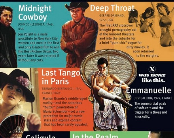 The Cheat, Traffic in Souls, Way Down East, Michael, Bed & Sofa, Red Dust, Queen Kelly, Ecstasy, The Outlaw, Tarzan and his Mate, Double Indemnity, Notorious, La Ronde, A Streetcar Named Desire, And God Created Woman, Baby Doll, Dr. No, I Am Curious (Yellow), Blow-Up, Midnight Cowboy, Deep Throat, Last Tango in Paris, Emmanuelle, Caligula, In the Realm of the Senses, Betty Blue, Blue Velvet, Pretty Woman, Kids, Crash, Romance, Shortbus, Brokeback Mountain. Sursa.