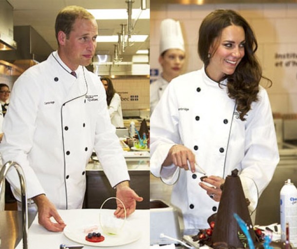 Printul William a intretinut atmosfera, a facut cateva glume si, de mai multe ori, a imbucat cate una alta de pe masa si a bagat o lingura in ciocolata topita. In tot acest timp, Catherine se concentra asupra retetei pe care trebuia sa o prepare, un foie gras, cu briose la cuptor si jeleu de cidru de mere. Ea a fost ghidata de catre Theresa Rindress: "am invatat-o cum sa tina cutitul, astfel incat sa nu se taie. S-a descurcat foarte bine."