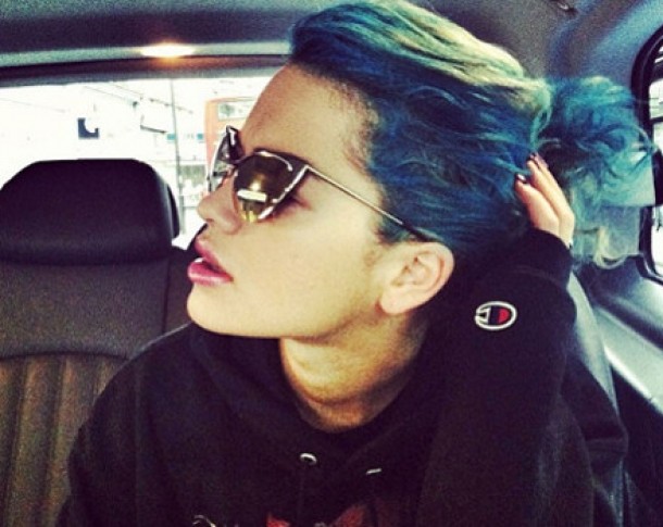 Aceasta a pozat pe bancheta din spatele unei masini, fiind imbracata intr-un hanorac negru, la care a asortat o pereche de ochelari de tip cat-eye, cu accente metalice. Parul il are prins intr-un coc dezordonat, iar lumina buna ne lasa sa observam pana in cel mai mic detaliu noua culoare a parului ei.