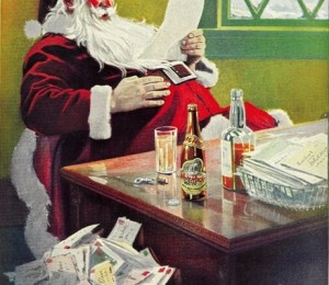 3. Mos Craciun bea bere. Da, este normal sa i se faca si Mosului sete, din moment ce munceste intr-o noapte cat altii intr-un an pentru a imparti cadourile tuturor oamenilor de pe planeta. Insa cineva ar trebui sa ii atraga atentia lui Mos Craciun ca nu este bine sa conduca sania sub influenta bauturilor alcoolice. Am gasit o serie de reclame din perioada interbelica, dar si dupa razboi care ni-l infatiseaza pe Mos Craciun extrem de insetat. Iar bautura care i-a cazut cu tronc este berea, pe care parca nu o poate lasa din mana.