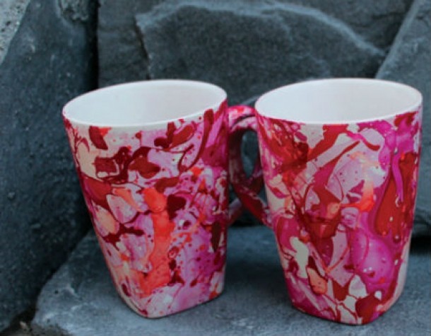 In recipientul cu apa toarna o picatura dintr-un lac de unghii si inca o picatura din celalalt lac de unghii, amesteca usor cu o scobitoare si introdu cana in apa. Cana ta va avea de acum un model deosebit si unic.