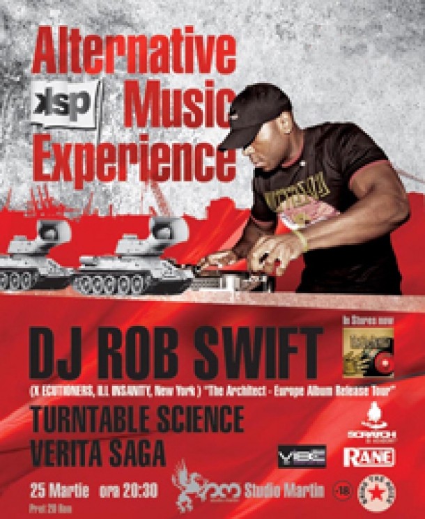 “Evenimentul Alternative Music Experience din 25 martie ii reuneste pe celebrul artist international DJ Rob Swift, trupa autohtona de turntable Turntable Science si una dintre cele mai de succes trupe de hip-hop din Romania, Verita Saga. Prin acest concert Alternative Music Experience, reusim sa prezentam publicului roman un stil inovator de muzica si materiale discografice noi, toti invitatii avand albume lansate de curand. Fanii vor avea parte de o atmosfera extraordinara, locatia fiind transformata pentru a incadra stilul muzical prezentat”, declara organizatorii.