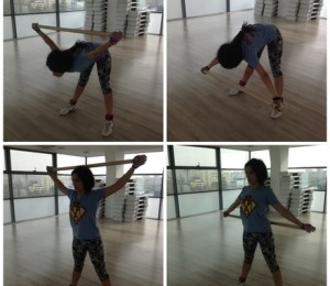 1. Umeri. Picioarele departate la nivelul umerilor cu bastonul tinut la spate, prindeti bastonul cu palmele la exterior si aplecati trunchiul pana formati unghi de 90 de grade, iar odata cu aplecarea trunchiului, lasati bastonul sa coboare pana ajunge deasupra capului, apoi reveniti usor la pozitia normala. Repetati acest exercitiu cu miscari ferme, 1 set a cate 16-20 de repetari.