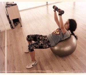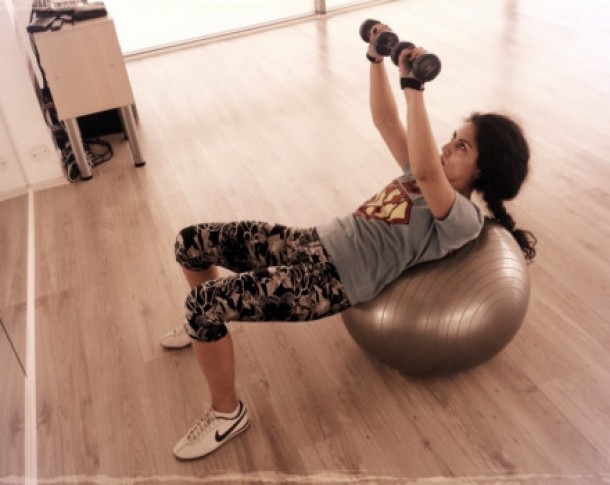 2. Brate. Asezati spatele pe mingea de fitness, luati greutati de 2-4 kg (in fiecare mana) si tineti bratele egale. Impingeti ganterele deasupra capului si apoi reveniti cu ele langa umeri. Executati acest exercitiu 2-3 seturi a cate 16-20 repetari cu pauza intre serii.