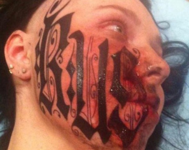 Lesya Toumaniantz a acceptat ca iubitul ei, Rouslan Toumaniantz, ii tatueze “Ruslan” pe ambii obraji, cu litere gotice, de aproximativ 12 centimetri.