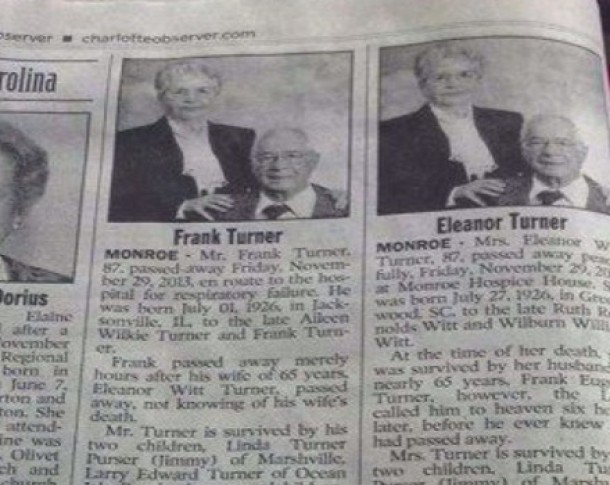 Cei doi s-au cunoscut in anul 1948, iar la putin timp s-au casatorit. Dupa 65 de ani de casnicie, 2 copii si 3 nepoti, Frank si Eleanor au plecat din aceasta lume in aceeasi zi, insa fara sa stie unul de celalalt.