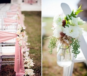 Dacă vrei să atragi atenţia şi mai mult asupra locului în care va avea loc cununia religioasă, ar trebui să iei în calcul şi scaunele. Pe acestea le poţi împodobi cu materiale fine, cu flori sau poţi atârna borcane cu flori de spătare.