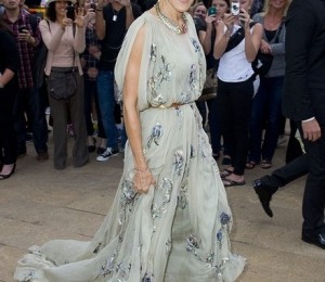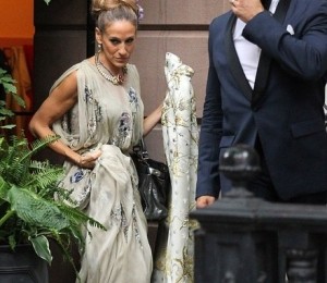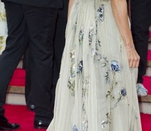 Sarah Jessica Parker, in varsta de 47 de ani, a purtat o rochie la fel de sofisticata, lunga, din material semi-transparent, pe care a accesorizat-o cu un colier si o curea aurie care sa ii sublinieze talia. Pantofii purtati de actrita ne amintesc de personajul interpretat in serialul Sex and the City, intrucat se asorteaza cu accesoriul de par pe care aceasta il poarta si cu geanta, avand o nuata inedita.