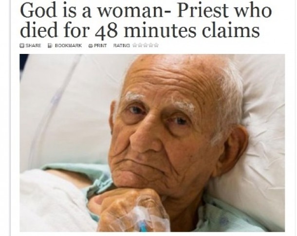 Un preot catolic din Massachussetts a fost mort in mod oficial mai bine de 48 de minute inainte ca medicii sa reuseasca in mod miraculos sa ii reporneasca inima. In acest interval de timp, parintele John Micheal O'neal pretinde ca el a mers in rai si ca l-a cunoscut pe Dumnezeu, pe care batranul il descrie ca fiind o figura placuta, calduroasa, chiar materna, care l-a facut sa se simta confortabil.