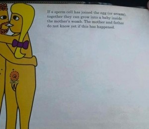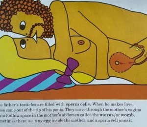 "Testiculele tatălui sunt umplute cu spermatozoizi. Atunci când el face dragoste, aceste celule ies prin vârful penisului lui. Spermatozoizii se mişcă de-a lungul vaginului mamei printr-un spaţiu îngust şi în abdomenul mamei, numit uter sau pântece. Uneori există acolo, în interiorul mamei, un mic ou, iar spermatozoidul i se alătură", se arată în cartea din 1975, volum ilustrat şi scris de Per Holm Knudsen.