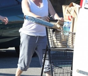 Actrita in varsta de 41 de ani a optat pentru o pereche de pantaloni de trening si un maieu alb, si a incercat sa treaca neobservata purtand si o pereche de ochelari.