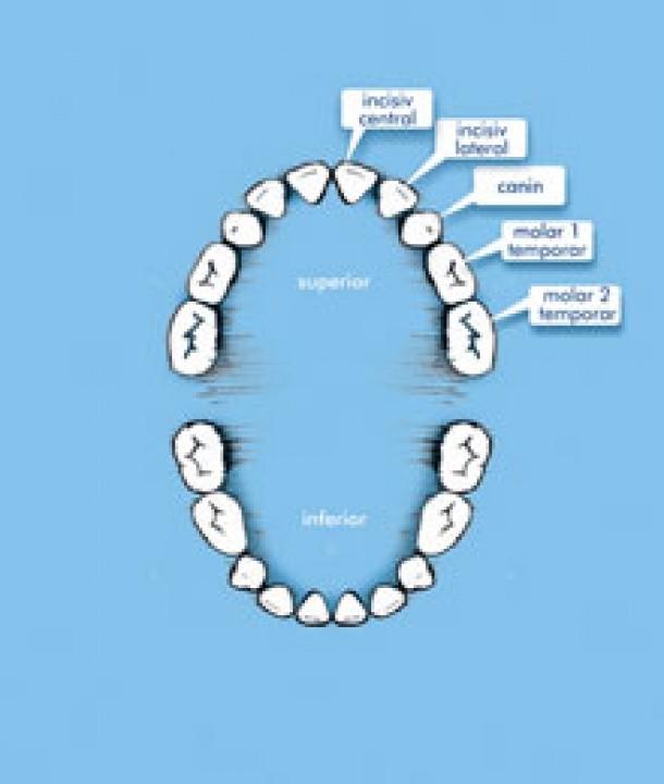 "Dintii temporari apare in trei etape caracteristice. In prima etapa erup incisivii, apoi primii molari (molar 1 temporar /schema), caninii si apoi molarii secunzi (molar 2 temporar/schema).