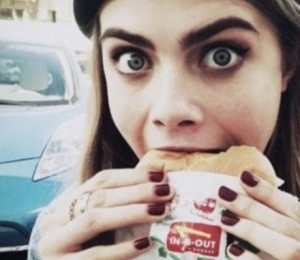 Cara are o adevarata slabiciune pentru preparatele junk-food si obisnuieste sa impartaseasca cu fanii de pe Facebook meniul ei zilnic. Astfel, nu de putine ori aceasta a postat fotografii in care apare mancand hamburgeri si cartofi prajiti, ceea ce demonteaza mitul potirivit caruia modelele ajung sa manance o data pe zi doar pentru a nu se ingrasa. Sau poate este ea mai norocoasa.