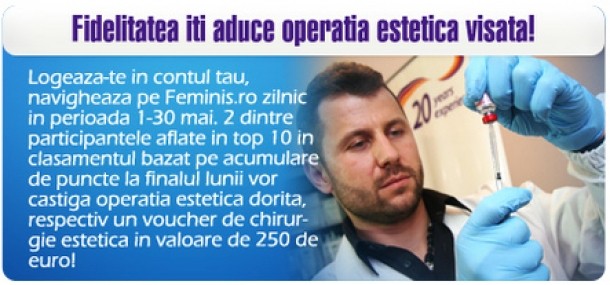 * Participantele aflate in top 10 in clasamentul bazat pe acumulare de puncte la finalul lunii mai vor fi rugate sa ne trimita o poza impreuna cu o descriere a lor, in care sa insereze si ce tip de interventie chirurgicala doresc. Cea mai interesanta descriere va fi premiata cu interventia chirurgicala visata.