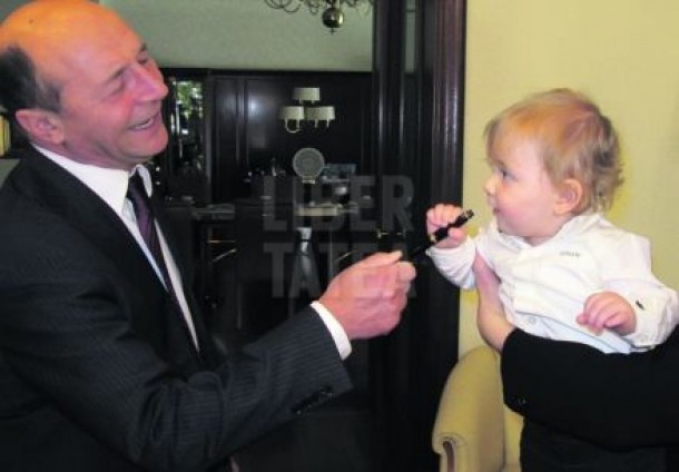 Cand a fost imbiat de nasi sa mai aleaga un obiect, Micul Print s-a uitat cu atentie in jur si, zambind, a apucat de pe masa, inca o data, stiloul nasului. “Am semnat multe decrete cu el, dar ti-l dau tie. Are si cerneala in el, numai sa inveti tu sa te iscalesti”, i-a spus Basescu, razand, finului sau.
