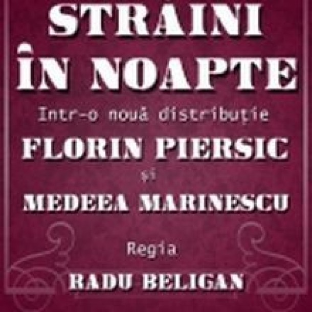 Incepand cu acest sezon, cuplul de straini in noapte va fi format din Florin Piersic si Medeea Marinescu, o actrita extrem de valoroasa pentru generatia sa, a carei interpretare va completa cum nu se poate mai bine jocul actoricesc unic si remarcabil al maestrului-coleg.