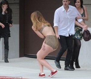 Aceasta avea doar un sutien si o pereche de chiloti cu model leopard, o pereche de pantaloni scurti roz si niste tenisi rosii in picioare.