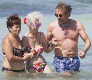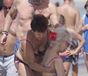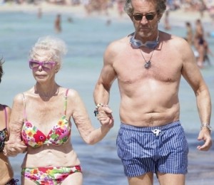 Cu toate ca are 86 de ani, ducesa de Alba pare sa se simta confortabil intr-un costum de baie din doua piese, la brat cu sotul ei si insotita de un ajutor, pentru a merge sa faca baie in mare.