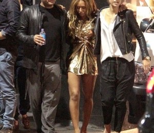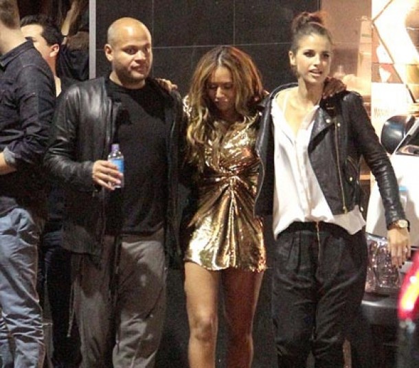 Rochia scurta aurie si o pereche de sandalele Louboutins cu un toc mult prea inalt i-au facut dificila sarcina fostei componente a trupei Spice Girls de a ajunge pana la masina. A avut nevoie de ajutorul sotului ei si al unei prietene care au dus-o aproape pe brate pana la portiera taxiului. Apoi cand sa intre in masina, cantareata l-a luat pe sotul ei de gat si nu a mai vrut sa ii dea drumul. Din fericire, aceasta incapatanare i-a fost de mare ajutor cand in urmatoarea secunda si-a pierdut echilibrul si a alunecat. Rochia i-a fost ridicata si fotografii au putut surprinde mai mult decat se dorea.