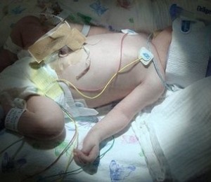 Copilul a fost nascut prin cezariana in regim de urgenta, cu sase saptamani inainte de termen, dupa ce mama nu a simtit nicio miscare a bebelusului in pantece timp de trei zile. Dupa o ecografie in care s-a adeverit ca bebelusul nu misca intr-adevar, medicii au decis ca trebuie sa intervina.