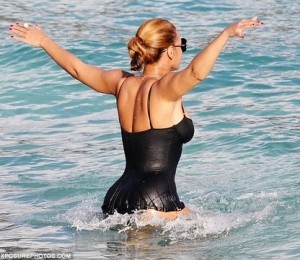 Beyonce si Jay-Z au fost surprinsi de paparazzi relaxandu-se pe plaja. Beyonce a optat pentru un costum de baie intreg, semn ca inca nu este sigura pe ea sa isi expuna abdomenul asa cum ne-a obisnuit. S-a bucurat si de apa si a inotat cateva minute, iar dupa ce a iesit din mare, costumul de baie mulat ne-a aratat ca Beyonce se afla intr-o conditie fizica foarte buna avand in vedere ca a nascut in urma cu doar trei luni. In ceea ce ne priveste, Beyonce a trecut cu brio proba costumului de baie.