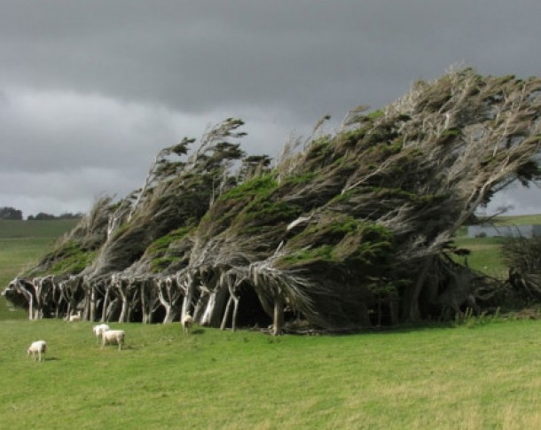 Copacii de la Slope Point, cel mai sudic punct din Noua Zeelanda, sunt de-a dreptul impresionanti, fiind crescuti intr-o parte din cauza vanturilor antarctice puternice.