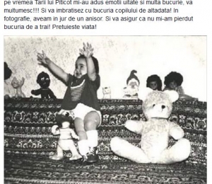 "Bună dimineaţa! Mesajele voastre de aseară în urma postării fotografiei de pe vremea Ţării lui Piticot mi-au adus emoţii uitate şi multă bucurie, vă mulţumesc!!! Şi vă îmbrăţisez cu bucuria copilului de altădată! În fotografie, aveam în jur de un anişor. Şi vă asigur că nu mi-am pierdut bucuria de a trăi! Preţuieşte viaţa!", a scris Andreea Marin pe pagina oficială de Facebook.