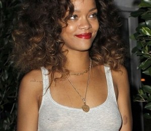 Rihanna a purtat modelul inedit de sandale in combinatie cu o pereche de pantaloni stil harem, de culoare neagra si un maieu gri, la care artista a ales sa nu poarte sutien, lucru care s-a putut vedea foarte bine.