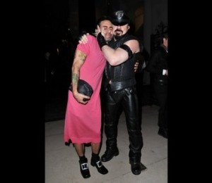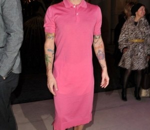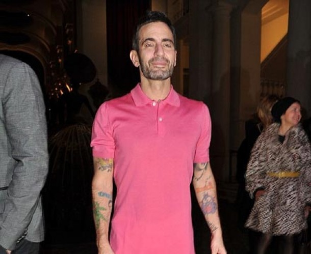 Celebrul designer a venit imbracat intr-o rochie roz, stil tricou, lunga pana la genunchi. Marc nu a uitat nici de accesorii si a optat pentru o poseta stil plic, din piele, pe care a tinut-o elegant sub brat. Era incaltat cu o pereche de pantofi care se asemanau mai degraba cu cei ai unui pirat si ale caror catarame erau incrustate cu diamante.